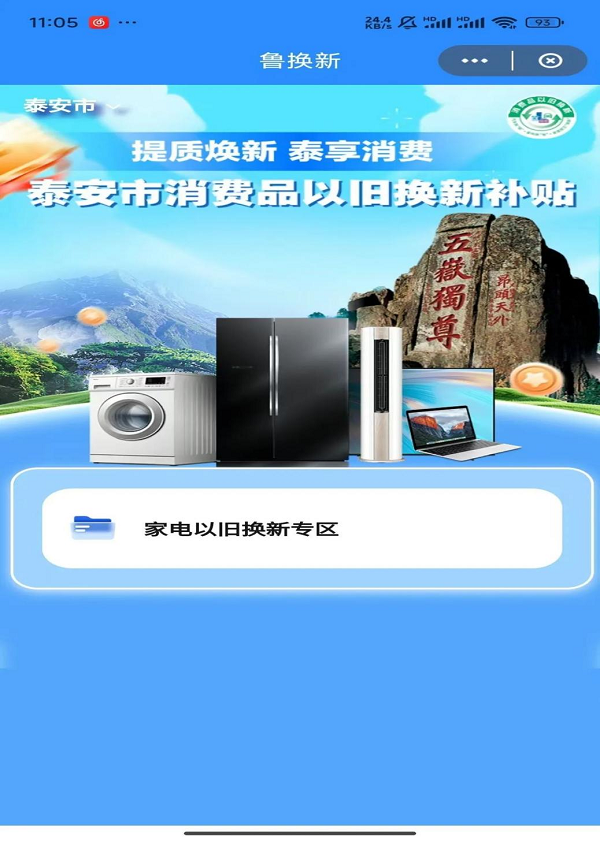 用戶登錄云閃付 app,搜索進入“魯換新”小程序,點擊左上角“請選擇地市”,在下拉菜單中選擇“泰安市”,點擊確認(rèn),進入泰安市消費品以舊換新補貼界面,或搜索“魯換新”小程序獲取你的地理位置泰安市,確認(rèn)同意,可進入泰安市消費品以舊換新補貼界面,點擊進入“家電以舊換新專區(qū)”。